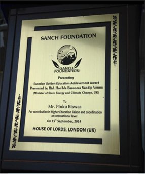 Pinku received the prestigious Eurasian Golden Achievement Award for his contribution towards higher education and liaison at an international level at the House of Lords, London (UK).